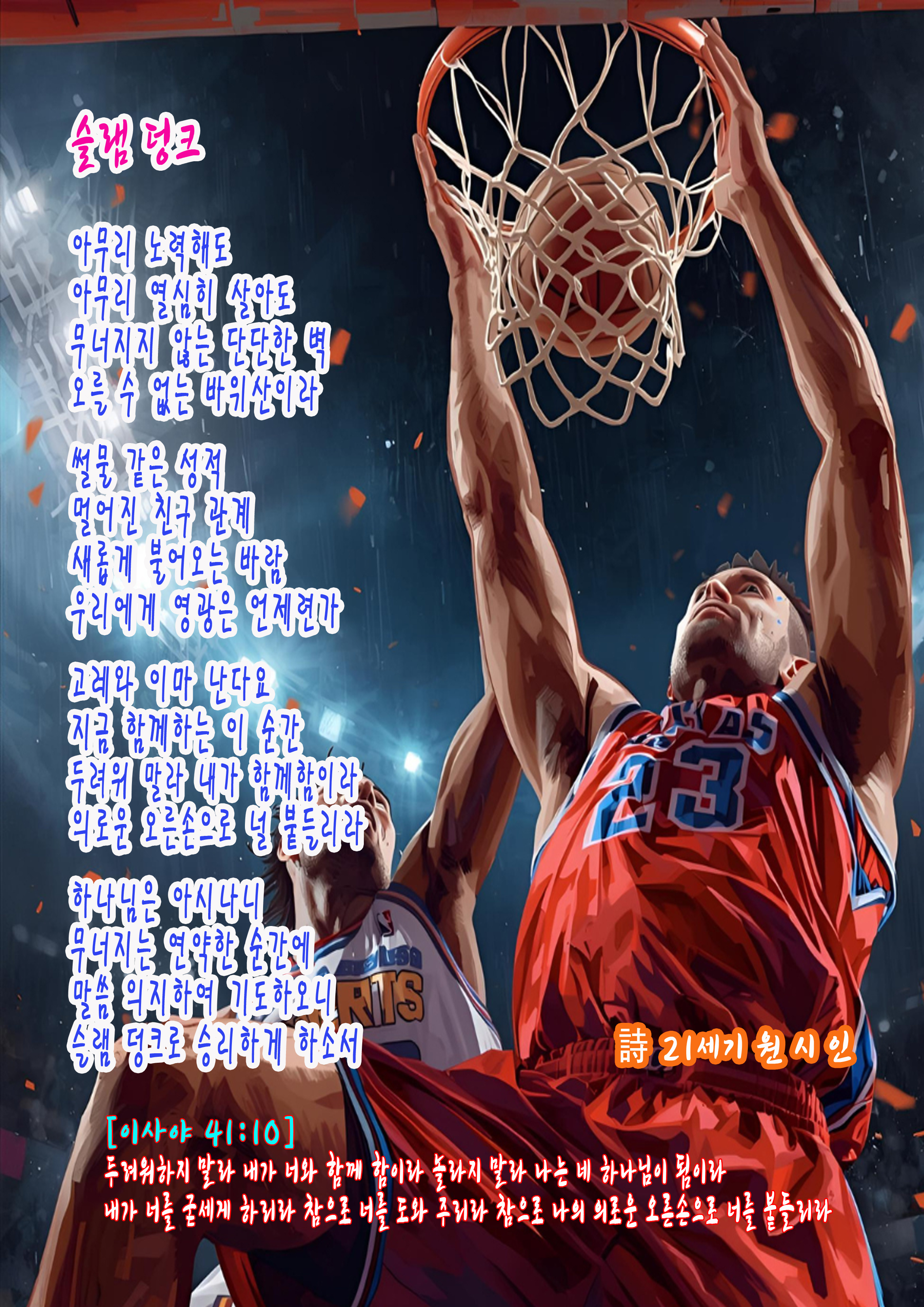 인생에는 아무리 애써도 넘을 수 없는 벽이 있습니다. 학업과 관계가 무너질 때 마음은 쉽게 낙심합니다. 그러나 하나님은 지금 이 순간에도 우리 곁에 계십니다. “두려워 말라, 내가 너와 함께하노라” 말씀하십니다. 넘어지고 흔들릴 때 의로운 오른손으로 붙드십니다. 말씀을 붙잡고 기도할 때 용기가 다시 솟습니다. 마침내 승리의 슬램 덩크로 영광 돌리게 하십니다.
