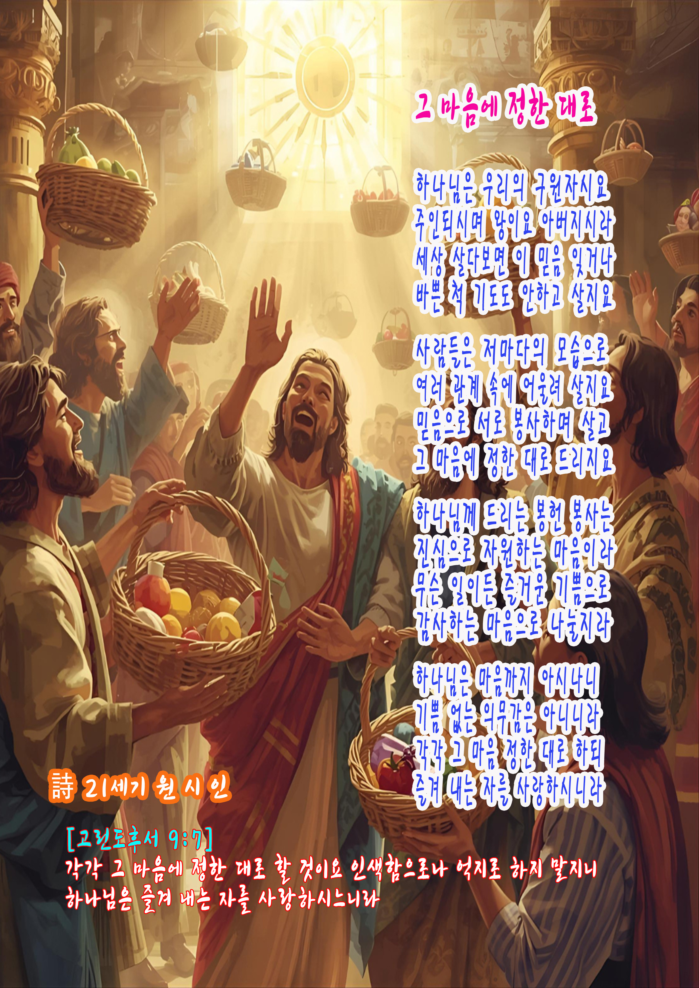 하나님은 억지로 받지 않으시고 마음을 보시는 분이십니다. 기쁨 없는 의무감은 사랑이 아니요, 감사와 자원함이 참된 봉헌입니다. 사람은 저마다의 삶 속에서 믿음으로 봉사하고 나눌 때 즐겨 내는 자를 하나님은 기뻐하십니다.