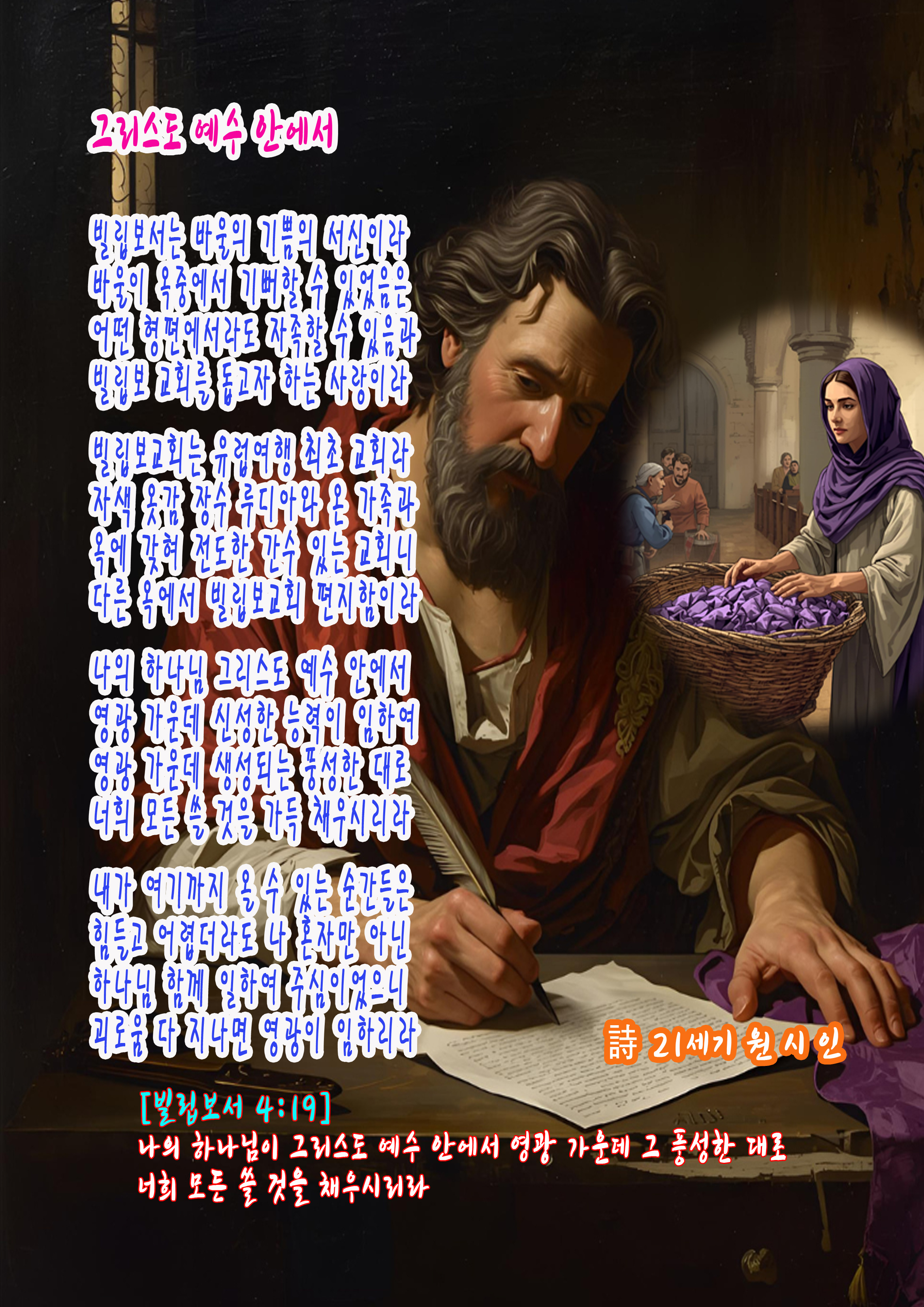 빌립보서는 바울의 기쁨의 서신이라 옥중에서도 감사와 기쁨을 고백하였습니다. 그는 자족할 줄 아는 믿음과 빌립보 교회의 사랑을 통해 힘을 얻었습니다. 루디아의 가정과 간수의 회심으로 세워진 교회는 바울의 특별한 동역자가 되었습니다. 바울은 그리스도 예수 안에서 모든 쓸 것을 채우시는 하나님의 풍성함을 선포하였습니다. 우리의 삶이 힘들고 어렵더라도 하나님은 결코 홀로 두지 않으십니다. 함께 일하시며 괴로움을 지나 영광으로 인도하시는 분이 하나님이십니다. 그러므로 우리는 어떤 형편에서도 주 안에서 감사하며 기뻐해야 합니다.