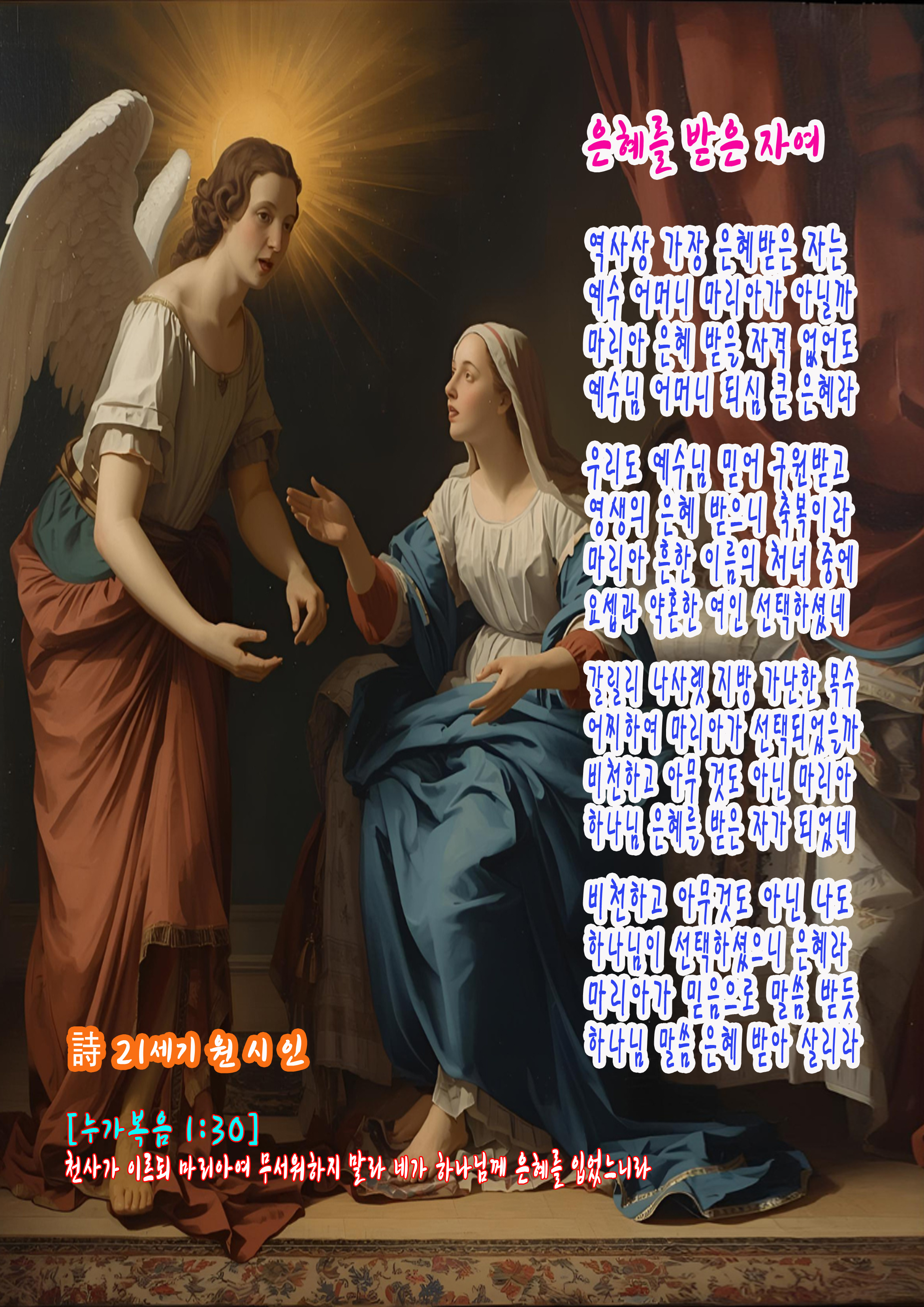 30 천사가 이르되 마리아여 무서워하지 말라 네가 하나님께 은혜를 입었느니라
