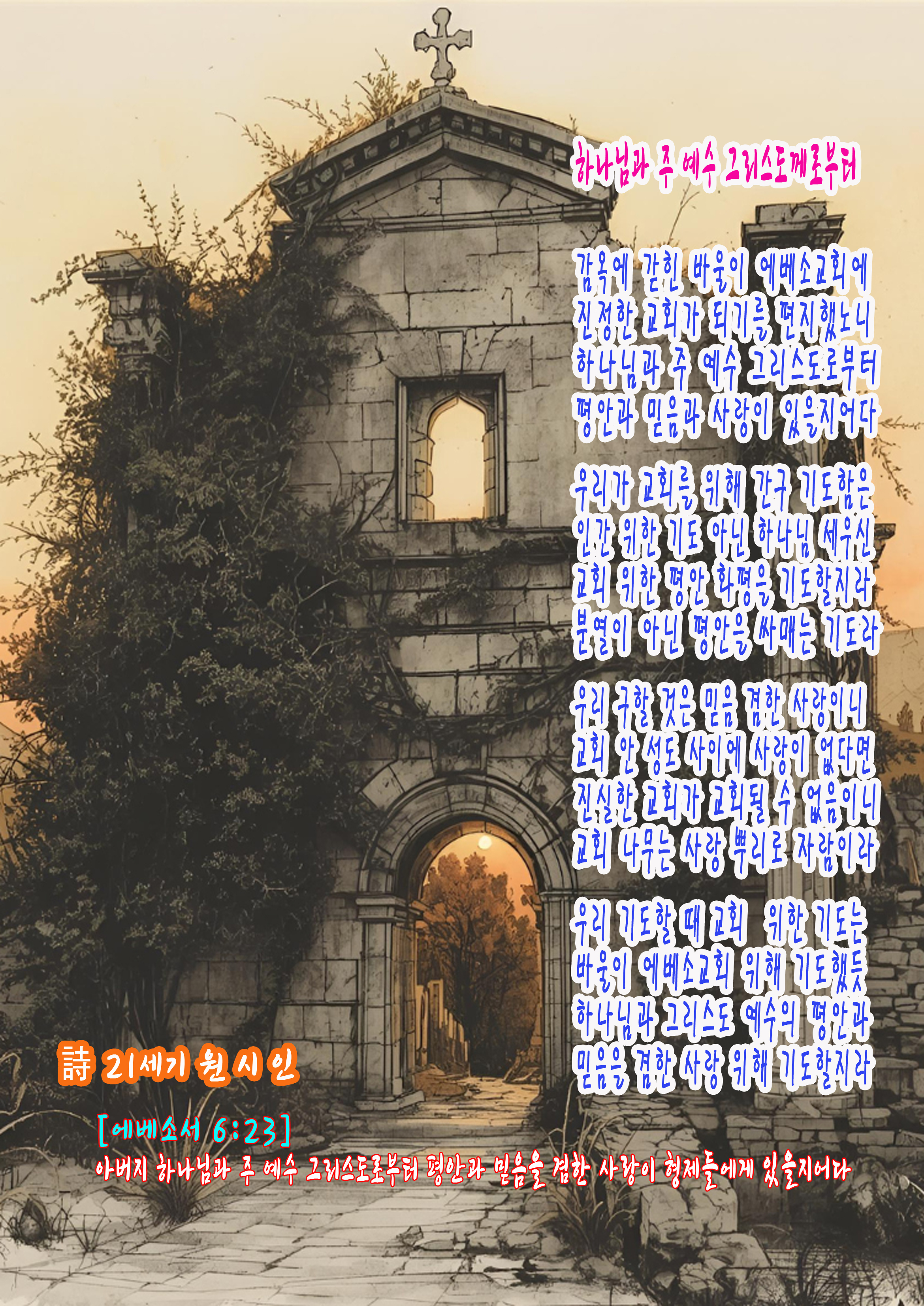 감옥에 있던 바울은 교회를 위해 평안을 기도했습니다. 분열이 아닌 화평으로 하나 되길 간구했습니다. 믿음을 겸한 사랑이 교회 뿌리가 됩니다. 교회는 사람 아닌 하나님 뜻 위에 섭니다. 주께서 주신 평안으로 교회가 세워집니다.