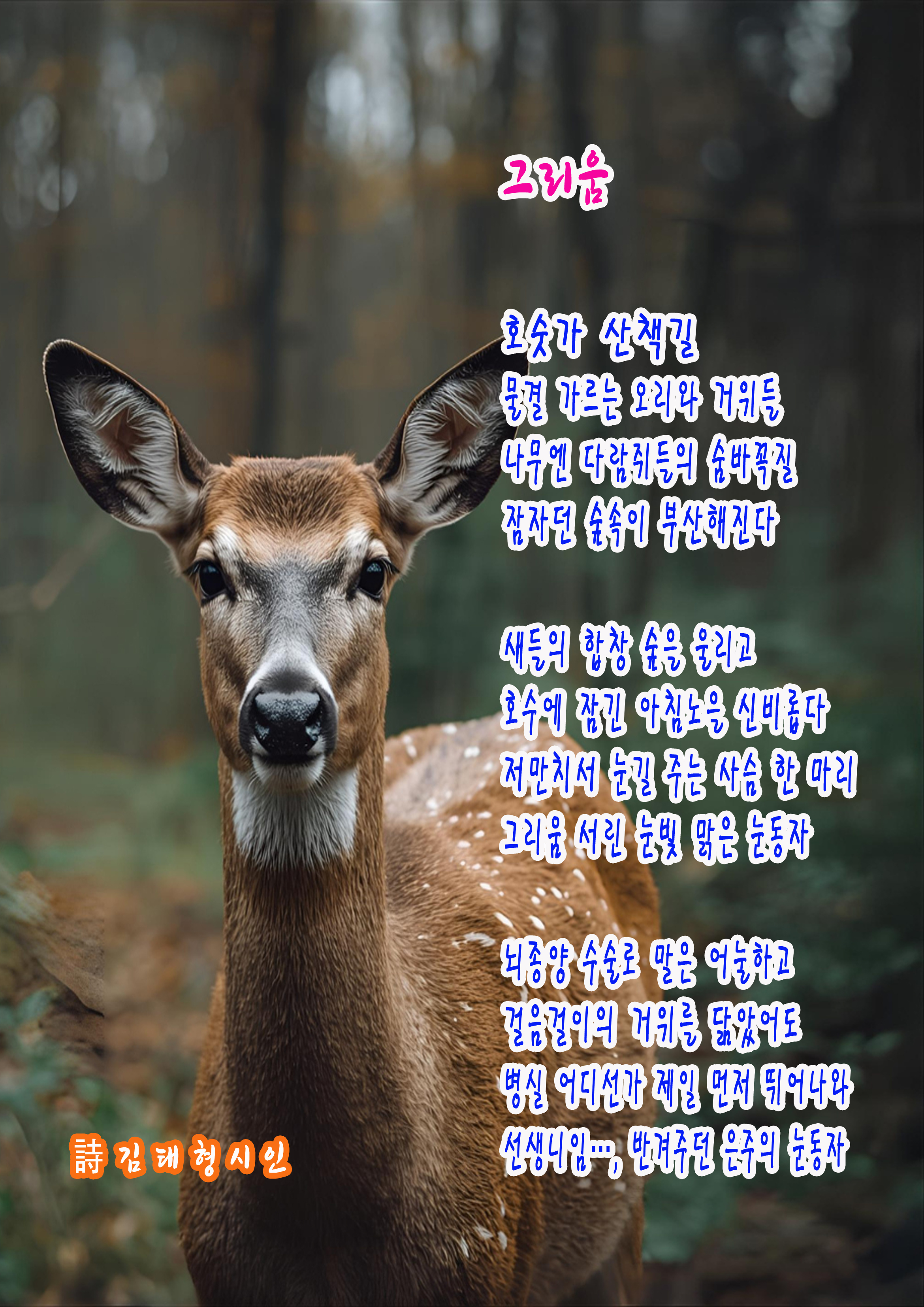 이 시의 힘은 담담함 속의 깊이에서 나온다. 시인은 어떤 감정도 과장하지 않는다. 호수와 사슴과 환한 눈동자가 차례로 등장하며 감정은 자연스럽게 고조된다. 그리움이란 감정은 폭발적이거나 과시적인 방식으로 표현될 필요가 없다는 것을 시는 보여 준다. 삶의 많은 진실이 그렇듯, 깊은 마음은 언제나 조용하게 존재한다. 자연은 흐르고 계절은 바뀌지만, 마음의 자리는 여전히 선명하게 남아 있다. 시인은 그 자리에 비스듬히 서서 이 시를 떠올렸다.(시평 원시인 신호현)