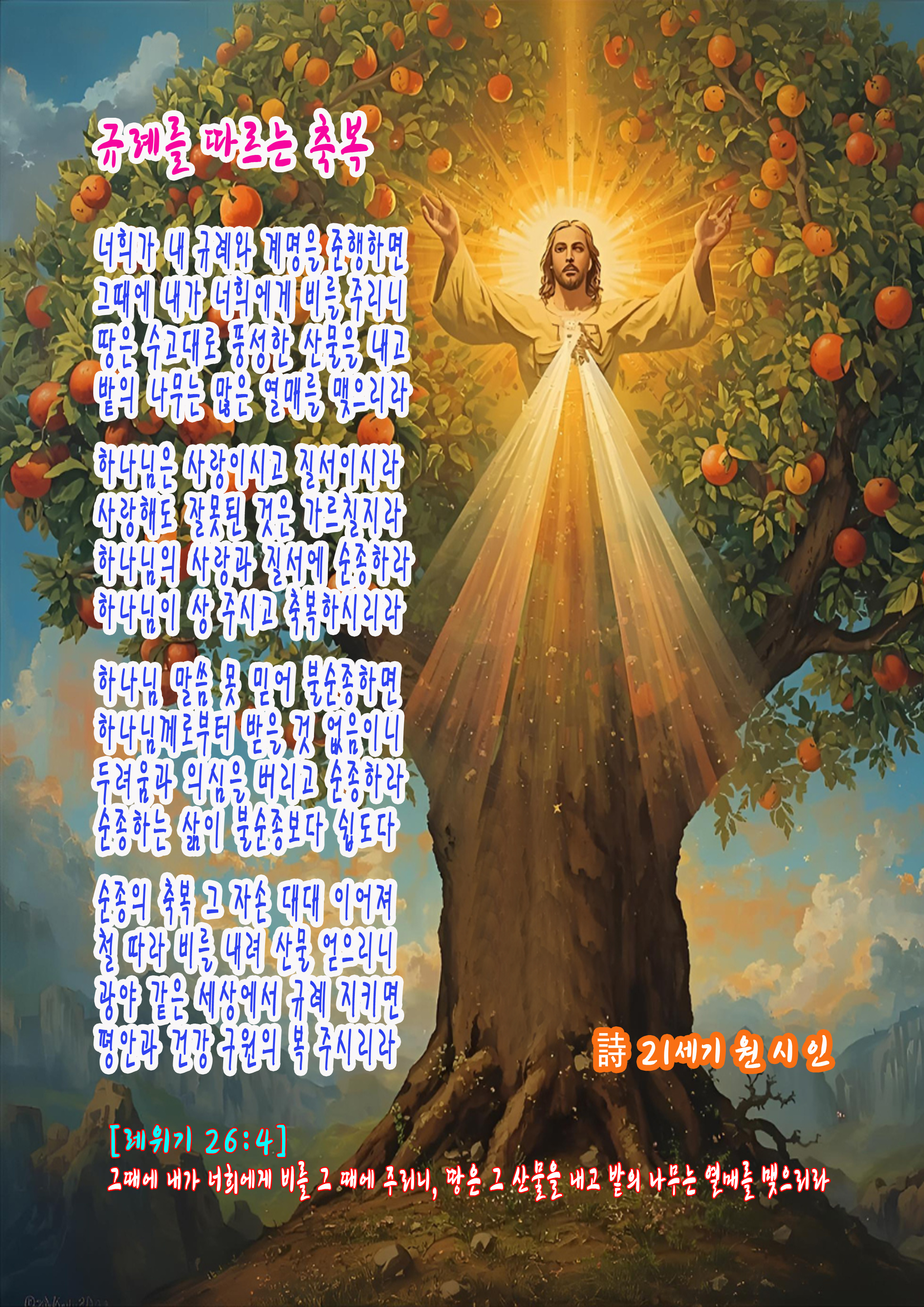하나님 말씀을 지키는 자에게 때를 따라 비를 내려 주십니다. 땅은 산물을 내고 나무는 열매 맺습니다. 하나님의 질서 안에 순종할 때 복이 옵니다. 불순종은 메마름이요, 순종은 풍요입니다. 주의 규례 따라 사는 자는 평안 누립니다.