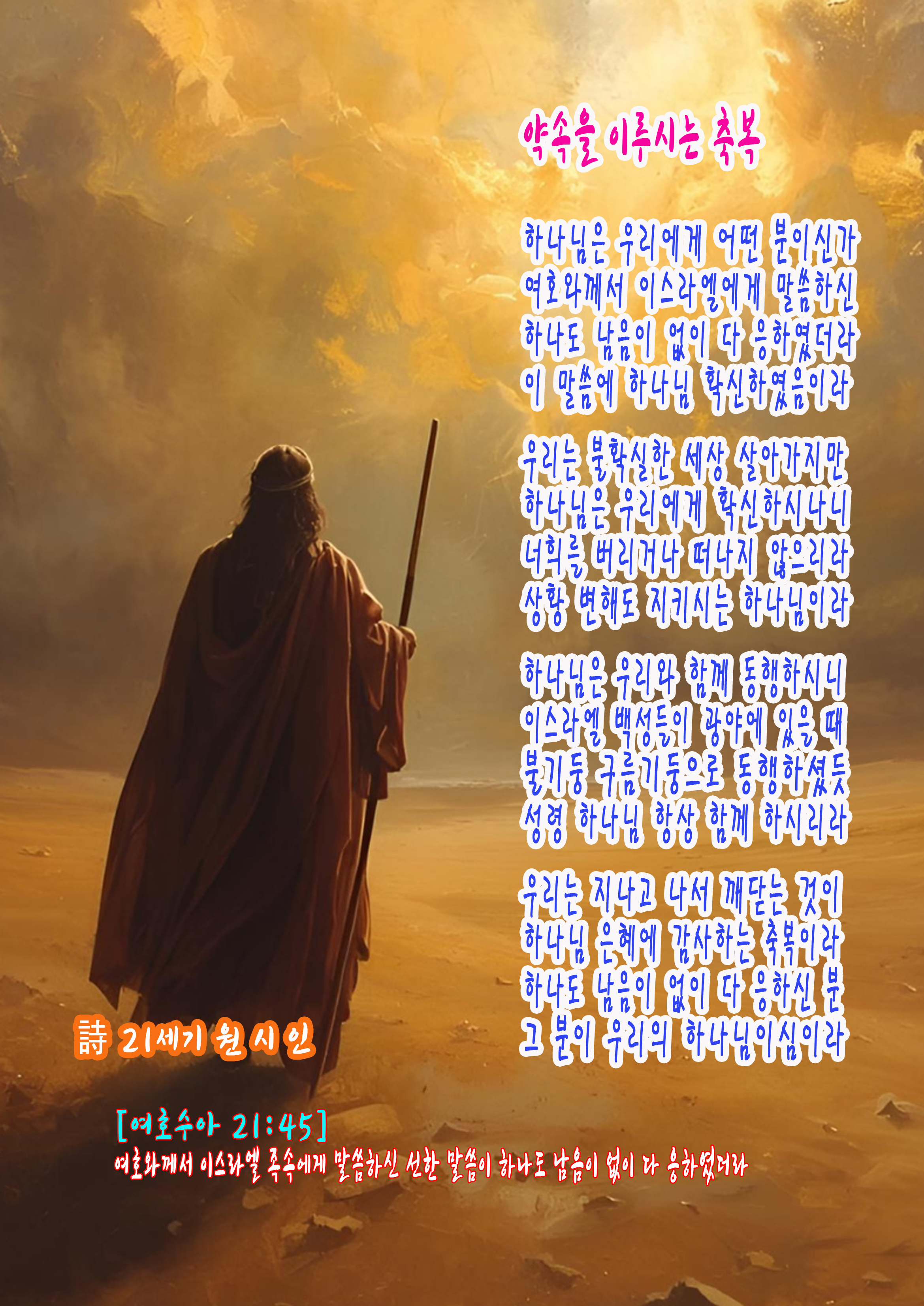 하나님은 약속하신 말씀을 하나도 남김없이 이루시는 신실하신 분이십니다. 이스라엘에게 주신 모든 선한 말씀이 다 응하였듯이 오늘 우리에게도 동일하게 역사하십니다. 우리는 불확실한 세상을 살지만 하나님은 결코 우리를 버리거나 떠나지 않으신다고 약속하셨습니다. 광야에서 불기둥과 구름기둥으로 동행하신 하나님은 오늘 성령으로 우리와 함께하십니다. 지나고 나서야 더욱 크게 깨닫는 은혜가 있으니, 모든 순간은 하나님의 인도하심의 증거입니다. 말씀하신 것을 하나도 남김없이 이루시는 분, 그분이 우리의 하나님이심을 고백합니다.