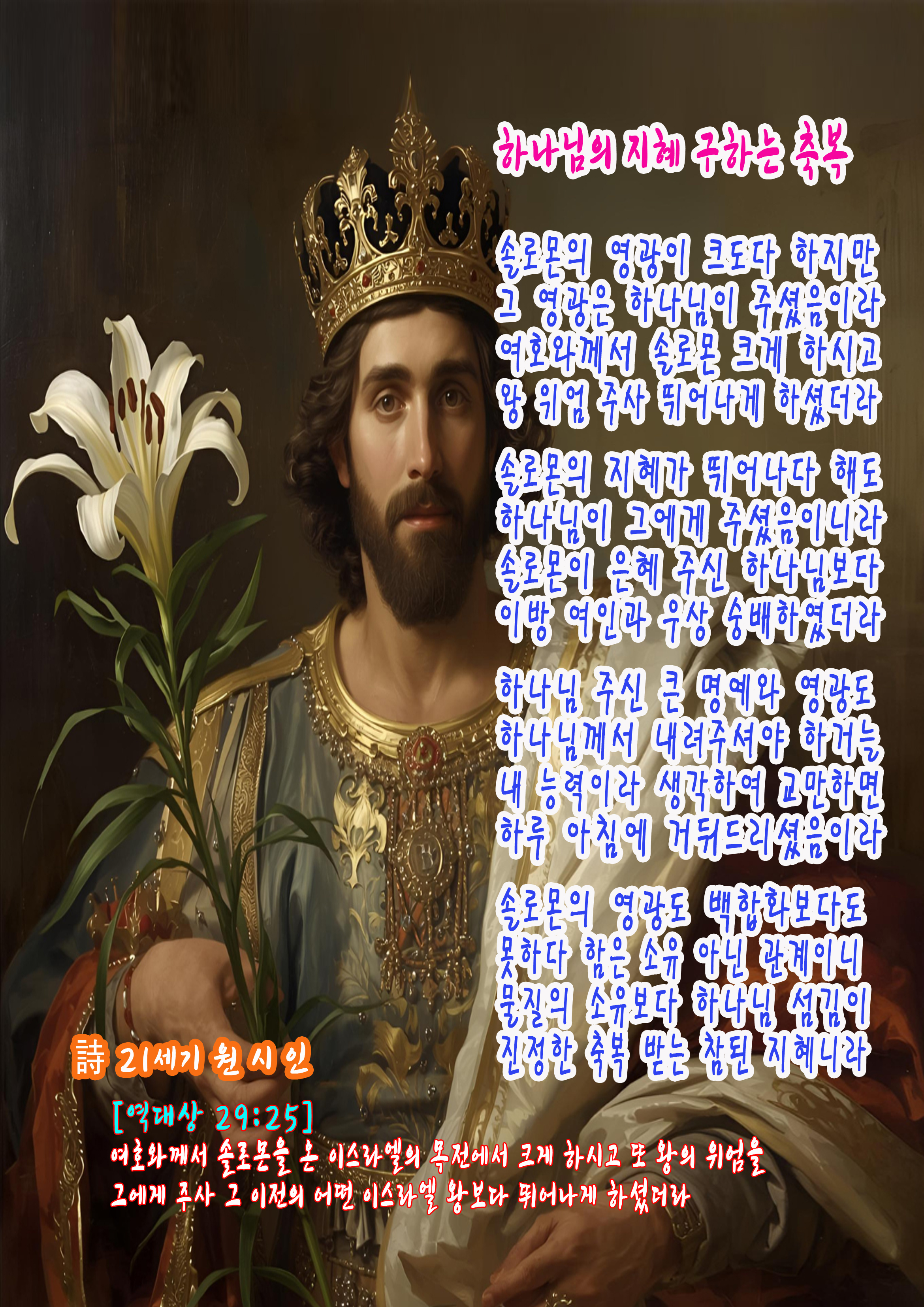 솔로몬의 영광은 그의 능력이 아니라 하나님이 높여 주신 은혜입니다. 여호와께서 그에게 권세와 위엄을 주사 어느 왕보다 뛰어나게 하셨습니다. 그러나 인간의 지혜가 아무리 뛰어나도 하나님을 떠나면 무너질 뿐입니다. 솔로몬이 우상과 이방 여인에게 마음을 빼앗기자 영광도 사라졌습니다. 명예와 성공도 하나님이 붙들어 주실 때 비로소 lasting한 가치가 있습니다. 그러므로 참된 지혜는 하나님을 경외하고 그분을 섬기는 데서 옵니다.