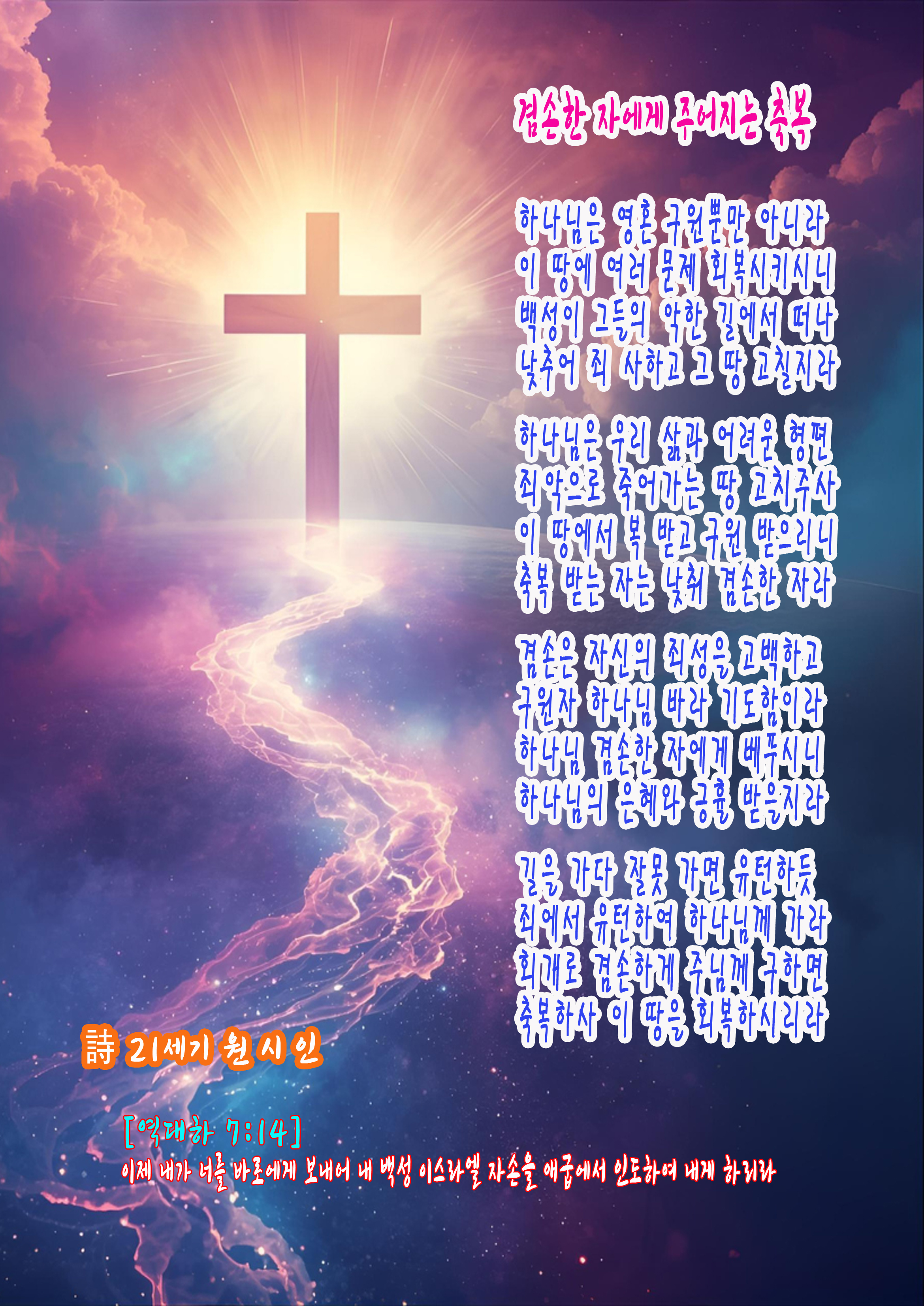 하나님은 악한 길에서 돌이켜 스스로 낮추는 자를 찾으십니다. 겸손히 기도하면 하나님은 들으시고 죄를 사하십니다. 상한 땅도 회복하시고 마른 영혼도 새롭게 하십니다. 겸손은 자신의 죄성을 인정하고 하나님만 바라보는 길입니다. 하나님은 교만한 자를 물리치시고 겸손한 자를 높이십니다. 그러므로 축복받는 삶은 늘 낮아져 하나님께 나아가는 삶입니다.