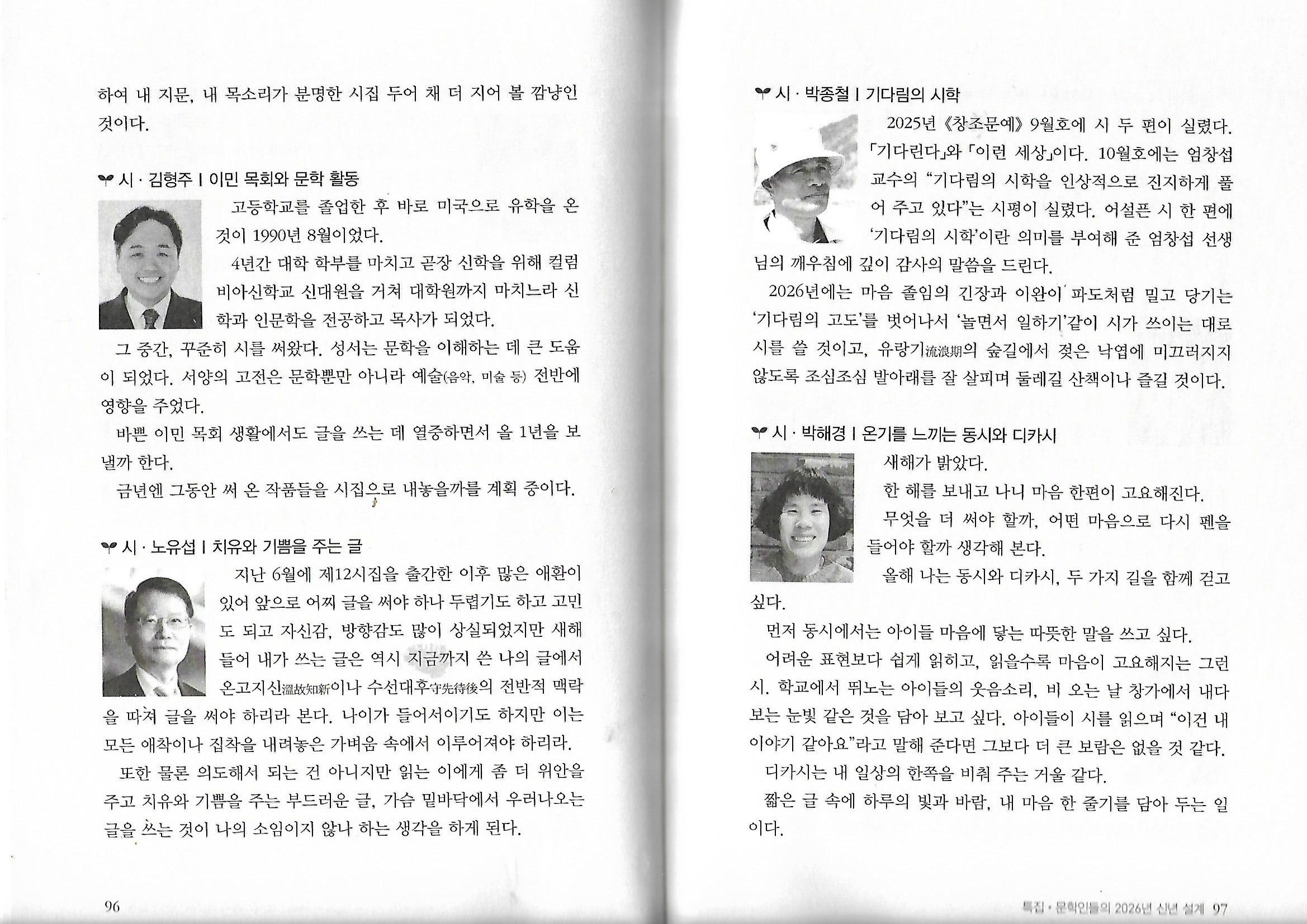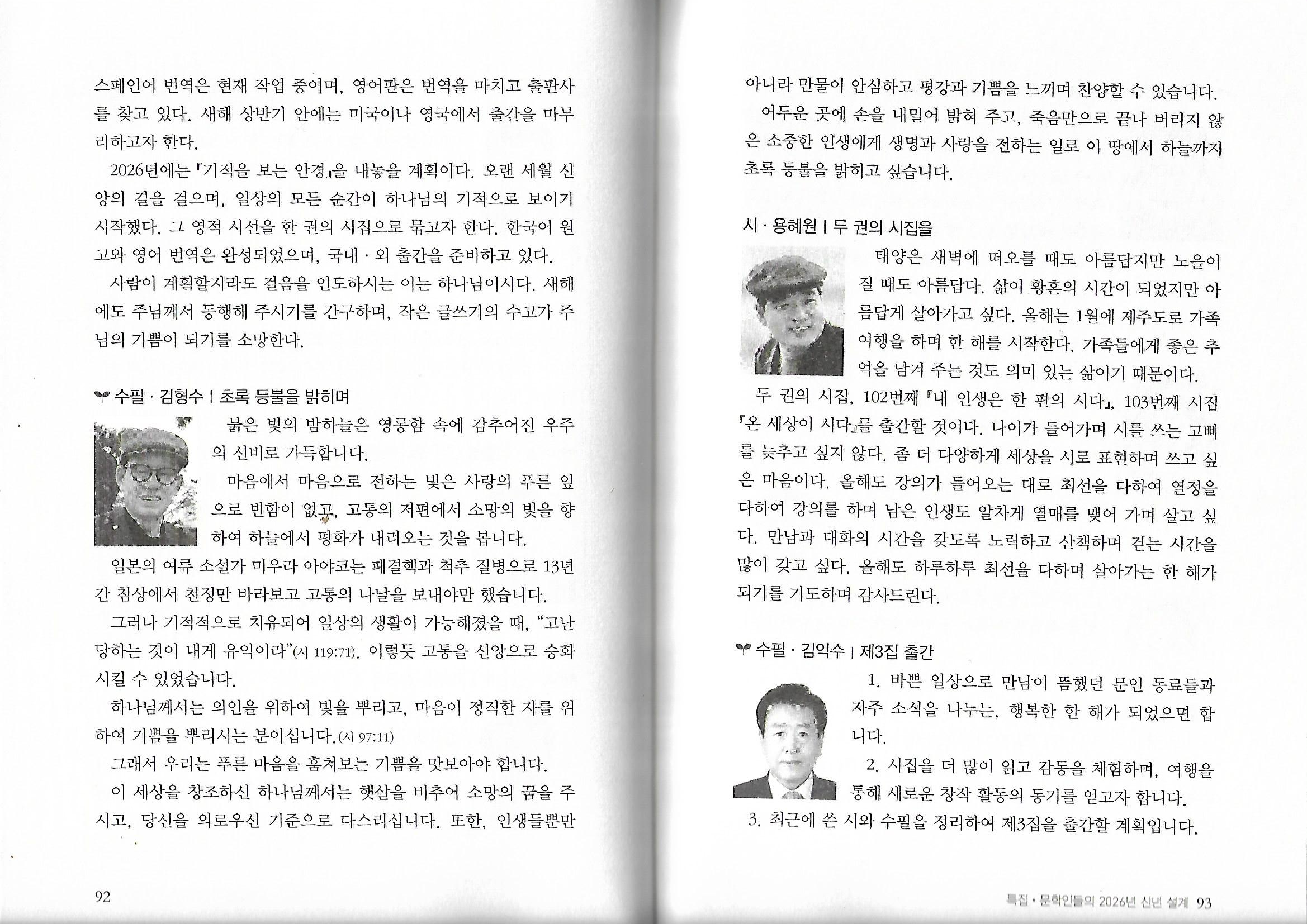 성경을 시로 쓰는 사명, 통일시를 쓰는 사명, 독립운동가, 참전 유공자들을 시로 기리는 일 모두가 가슴 뛰는 사명이다. 2026년은 오랫동안 기다렸던 '전업 시인'이 되는 해이다. 가슴 설레며 살아왔던 교직을 퇴직하는 해이다. 세상이 원시인을 '전업 시인'으로 내버려 둘지 모르지만 전업 시인의 기대와 희망은 버리지 않는다.