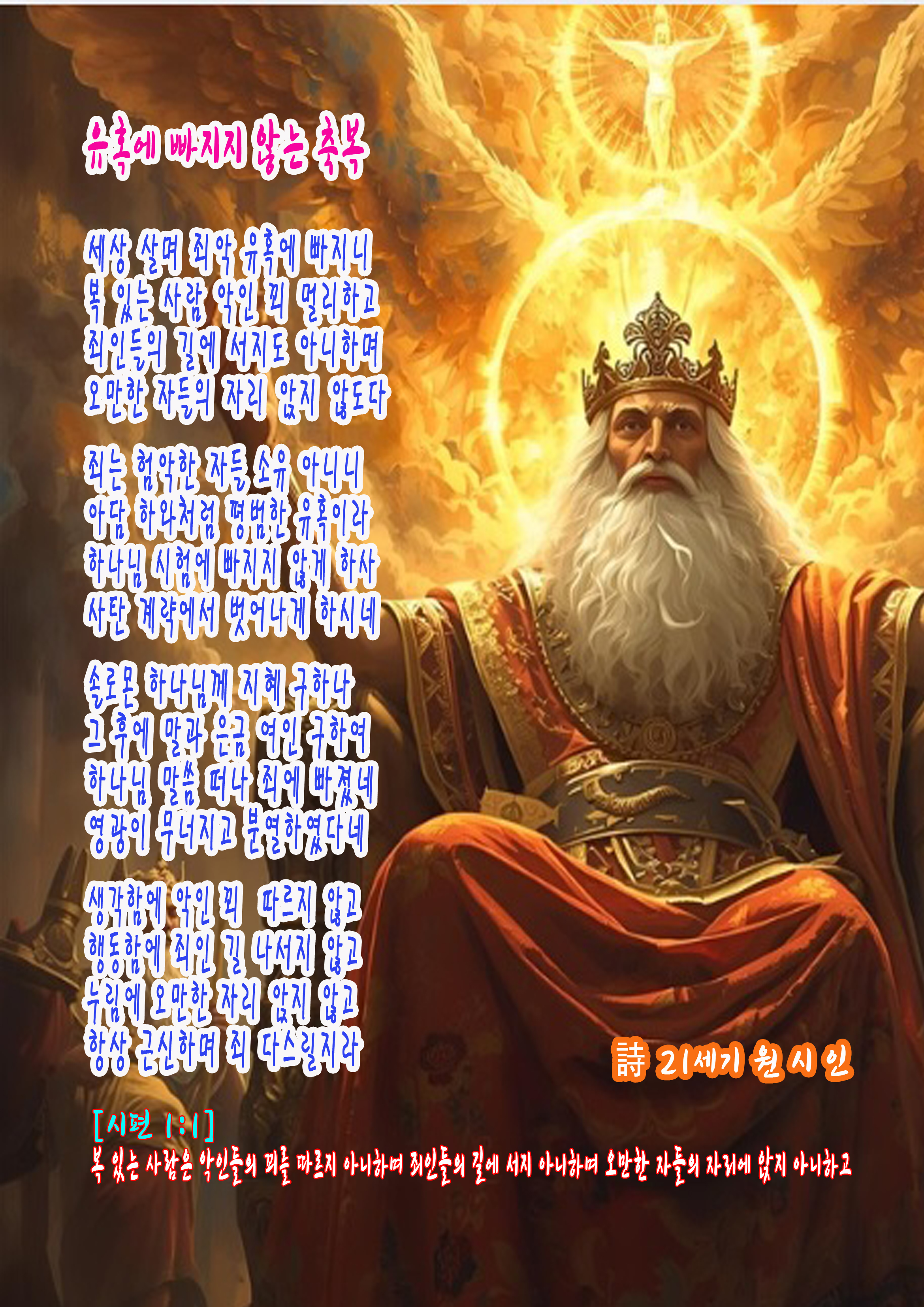 복 있는 사람은 악인들의 꾀를 따르지 아니하며 죄인들의 길에 서지 아니하며 오만한 자들의 자리에 앉지 아니하고