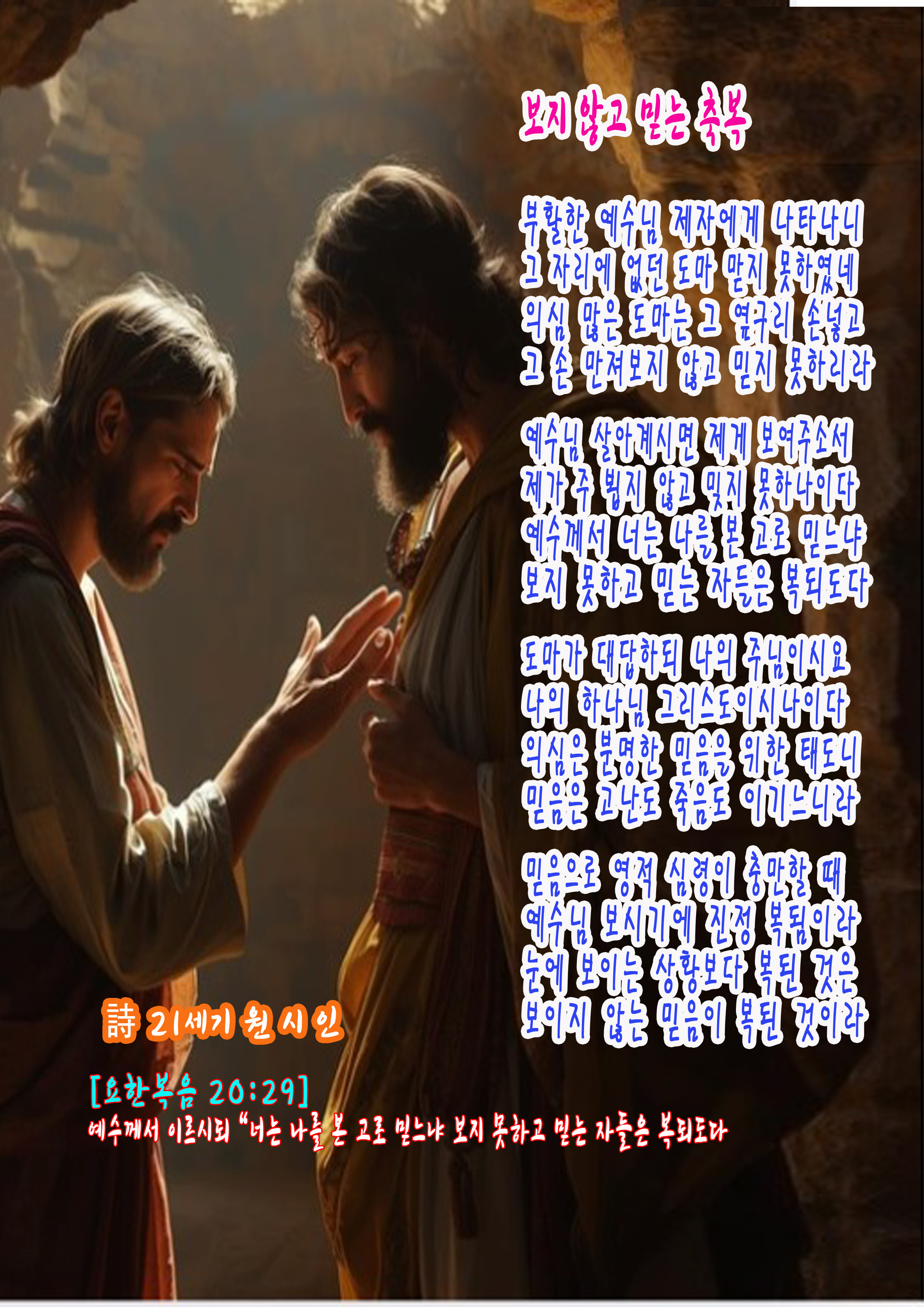 예수께서 이르시되 “너는 나를 본 고로 믿느냐 보지 못하고 믿는 자들은 복되도다