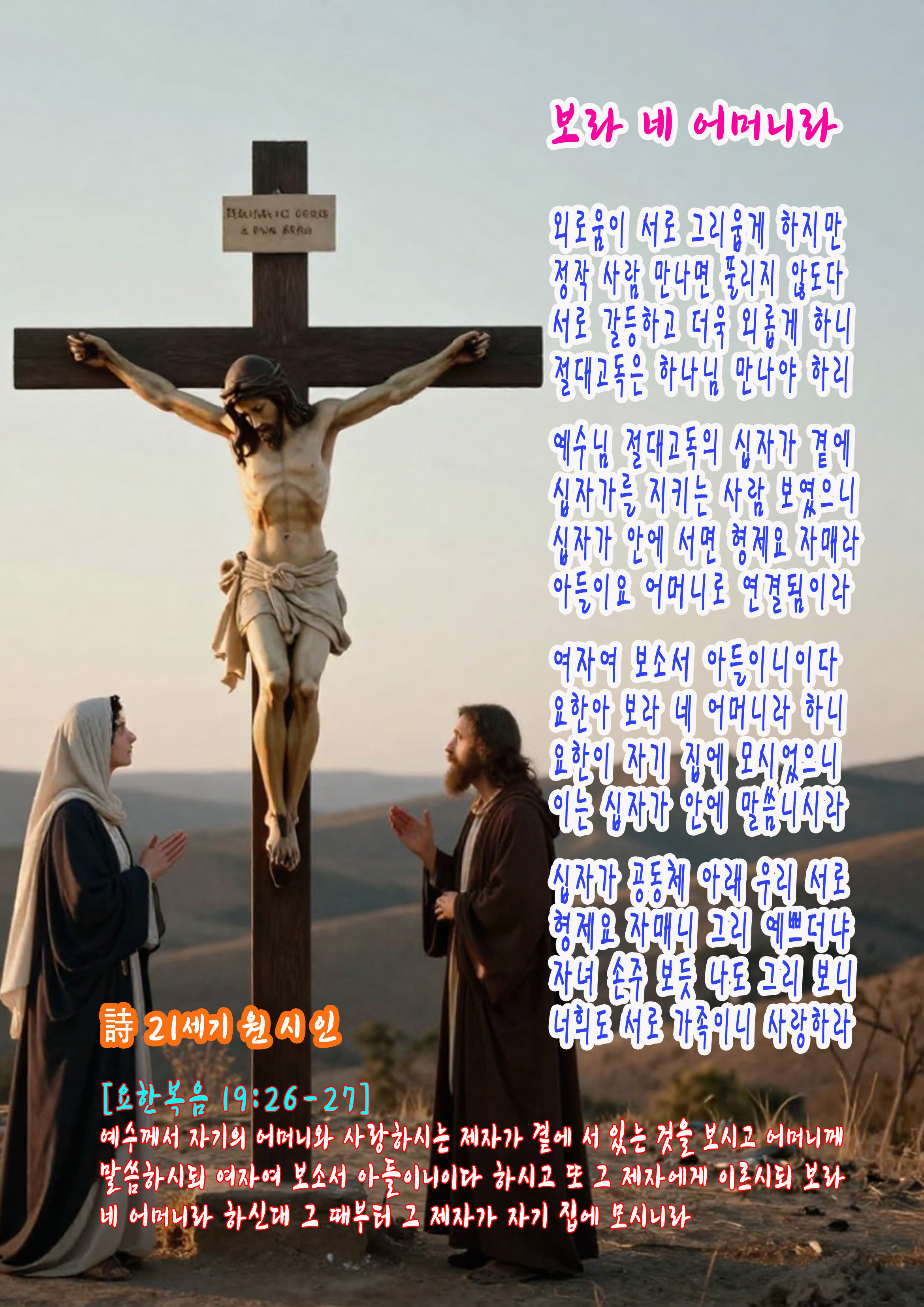 예수께서 자기의 어머니와 사랑하시는 제자가 곁에 서 있는 것을 보시고 어머니께 말씀하시되 여자여 보소서 아들이니이다 하시고 또 그 제자에게 이르시되 보라 네 어머니라 하신대 그 때부터 그 제자가 자기 집에 모시니라