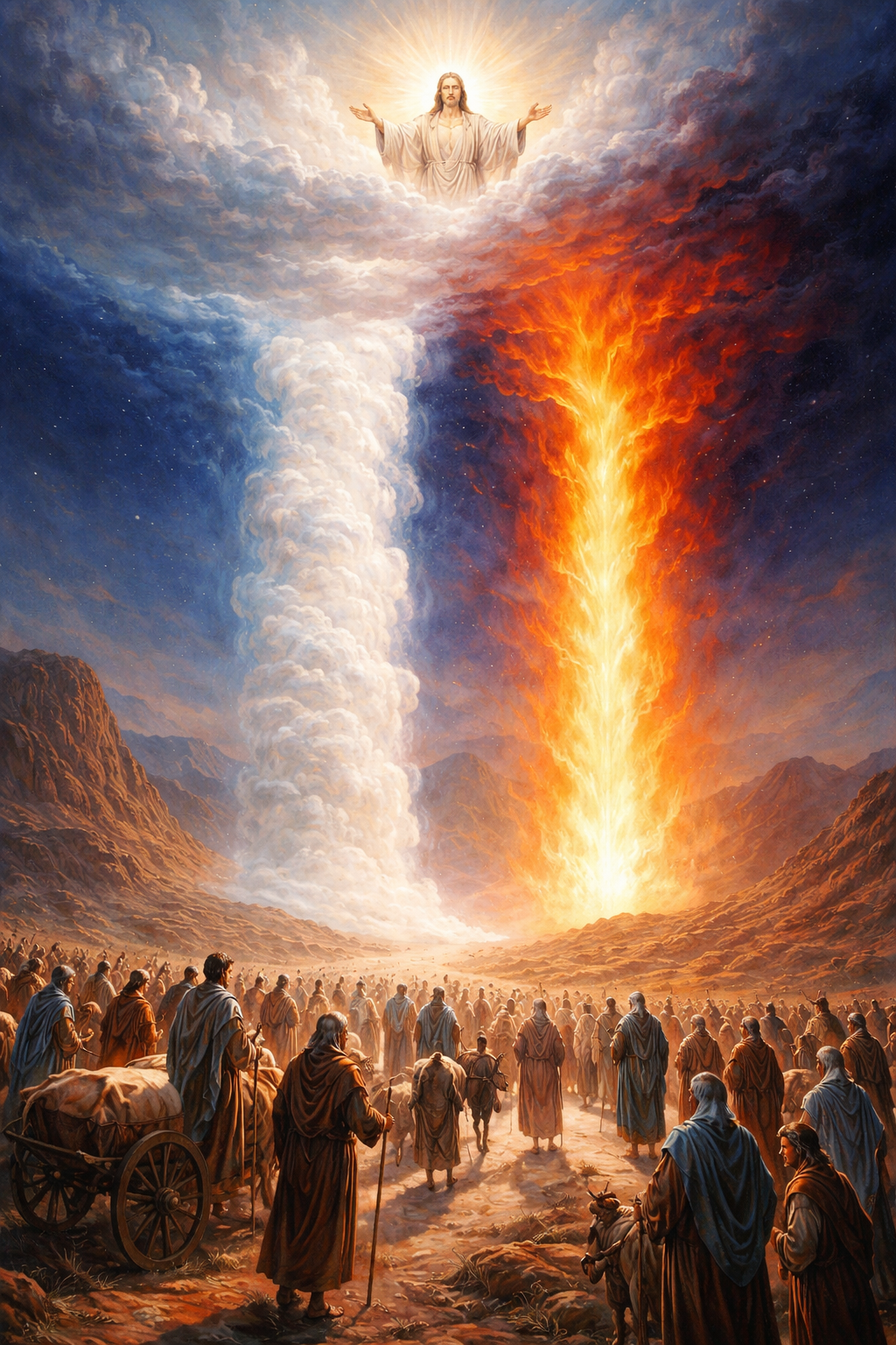 여호와께서 그들 앞에서 가시며 낮에는 구름 기둥으로 그들의 길을 인도하시고 밤에는 불 기둥으로 그들에게 비추사 낮이나 밤이나 진행하게 하시니 낮에는 구름 기둥, 밤에는 불 기둥이 백성 앞에서 떠나지 아니하니라